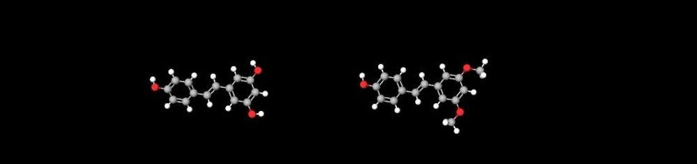 Chemical structures of two compounds found in red wine and berries that provide beneficial effects are shown. Resveratrol is on the left and pterostilbene is on the right.