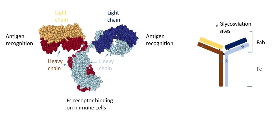 The left shows the structure of IgG2a and the right shows a diagram of the same antibody with the two domains of the antibody labeled. The Fab domain contains the part that recognizes the antigen and the Fc domain contains that part that binds to the Fc receptor on immune cells. Cleaving the antibody at the dotted line produces the two fragments. The Fc domains stay together because of the bonds between the heavy chains. The Fab domains separate into 2 linked fragments each containing the light chain and part of the heavy chain that make the antigen-recognition site. The antibody structure is from PDB:1IGT. Read more: