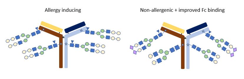 The schematics show an antibody with different patterns of glycosylation. Sugar moieties are indicated by differently colored shapes. The left schematic represents a glycosylation pattern that is frequently antigenic and produces allergic responses in patients. The right schematic shows different glycosylation patterns on the Fab and Fc portions of the antibody, eliminating antigenic patterns and improving therapeutic efficacy. Read more at