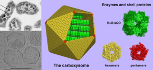 A three-part image of the cyanobacterial structure where carbon dioxide fixation occurs. (Left, above) A thin-section electron micrograph of H. neapolitanus cells with carboxysomes inside. In one of the cells shown, arrows highlight the visible carboxysomes. (Left, below) Purified carboxysomes (material courtesy of S. Heinhorst and G. Cannon) as visualized by cryo-electron microscopy (courtesy of M. Yeager and K. Dryden). (right) Models for the structure of the carboxysome. Current data suggest that the shell is composed of several hundred hexameric protein building blocks and 12 pentameric building blocks. The three-dimensional atomic structures of the shell proteins have been determined by X-ray crystallography. RuBisCO, the main interior enzyme is shown packed inside in a regular arrangement for simplicity, though the actual organization of the enzymes is not understood yet. The other key enzyme, carbonic anhydrase, which is present in lesser amounts, is not illustrated. Scale bars are 100 nm. (image by T. Yeates).