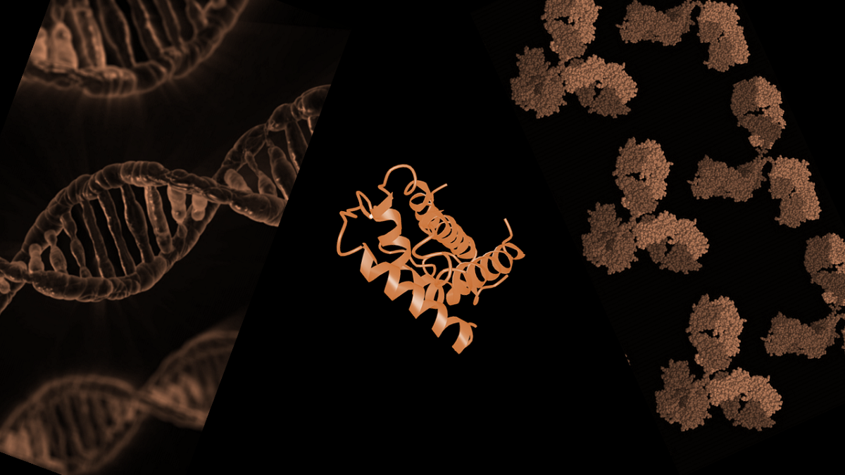 Mutations in genes in interferon signaling and autoantibodies targeting interferon explain ~14% of severe COVID-19 cases. Image shows DNA, interferon, and antibodies. [Credit: Nancy R. Gough, BioSerendipity, LLC]