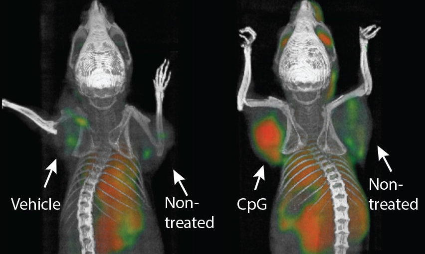 Image showing two mice with engrafted tumors. OX40 in the tumor injected with CpG ODN exhibits an increase in the amount of the receptor OX40 (orange) in the injected tumor only. OX40 is also present in other organs of the immune system in both mice. Credit: Sagiv_Barfi, et al. Sci Transl. Med. 10, eaan4488 (2018).