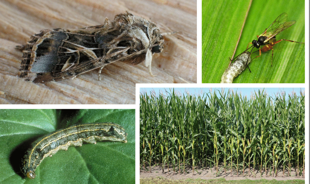 In this example of tritrophic interactions in agriculture, there is corn, a moth, and a wasp. The moth lays eggs on the leaves of the plant. When the eggs hatch, the caterpillars feed on the plant. The female wasp injects an egg into the caterpillar and, after hatching, the wasp larva feeds on the moth larva (caterpillar). From top left, Spodoptera littoralis adult (Bernard Fransen, Bugwood.org;), a wasp injecting an egg into a caterpillar (Ted Turlings, ScienceNews for Students), corn field (Medienservice, pixabay), Spodoptera littoralis (larva) (Biologische Bundesanstalt für Land- und Forstwirtschaft , Biologische Bundesanstalt für Land- und Forstwirtschaft, Bugwood.org)