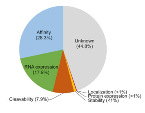 Variables that contribute to antigen prediction. 45% of the rules (variables) that control antigenic peptide presentation remain unknown. Pie chart shows that affinity for HLA is 28%, RNA expression is 18%, and cleavability is 8%. From Figure 5B, Abelin et al. Immunity 46, 315-326 (2017).
