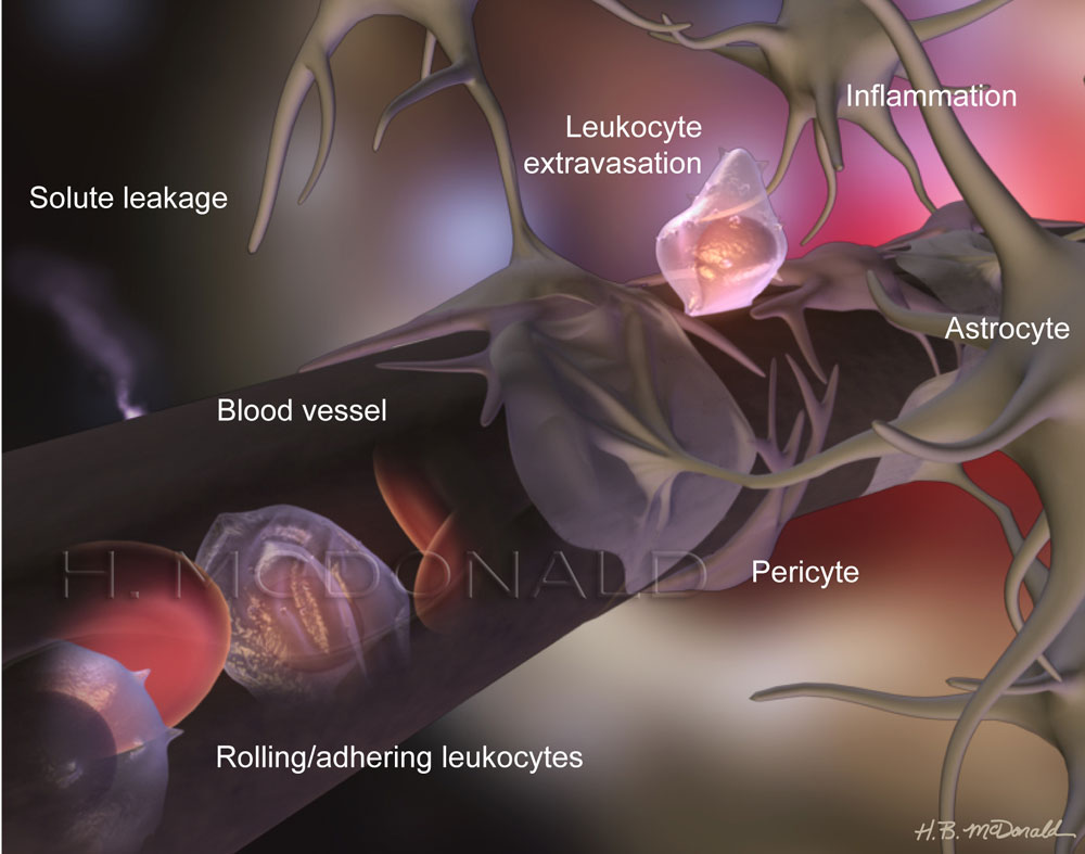 An illustration by Heather McDonald, showing how inflammation triggers the migration of blood cells into the brain.