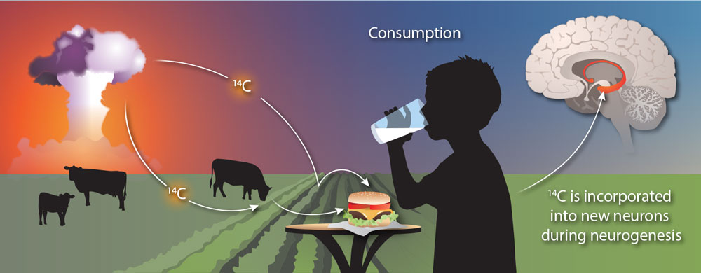 An illustration by Heather McDonald, showing how radioisotopes incorporated into neurons provide a way to measure neuronal age. Prepared for Science.