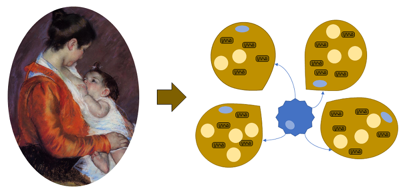 Lipids found in breast milk accumulate in the fat of nursing babies. In the fat tissue, the macrophages metabolize the lipids into the signaling lipid platelet-activating factor (PAF). PAF stimulates the macrophages to release interleukin 6, which maintains fat cells in a heat-producing state called beige adipocytes. Credit: The left image is from “Mary Cassatt, 1898 — Louise nursing her child”. The right image shows a macrophage (blue) surrounded by beige fat cells. Compilation by Nancy R. Gough, BioSerendipity, LLC