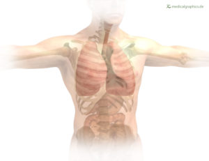 Lungs An illustration showing the skeleton and organs in the chest cavity. The trachea, lungs, ribs, collar bones, and parts of the gastrointestinal system are included. Image by www.MedicalGraphics.de ;license (CC BY-ND 3.0 DE)
