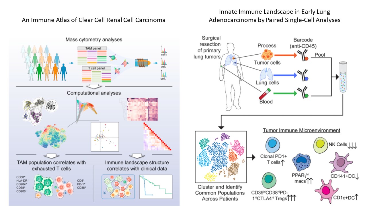 The image shows the graphical abstracts of Chevrier et al., Cell 169, 736–749 (2017) (left) and Lavin et al., Cell 169, 750–765 (2017) (right). These studies used single-cell analyses methods to discover the immune cells in kidney (left) or lung (right) cancers.