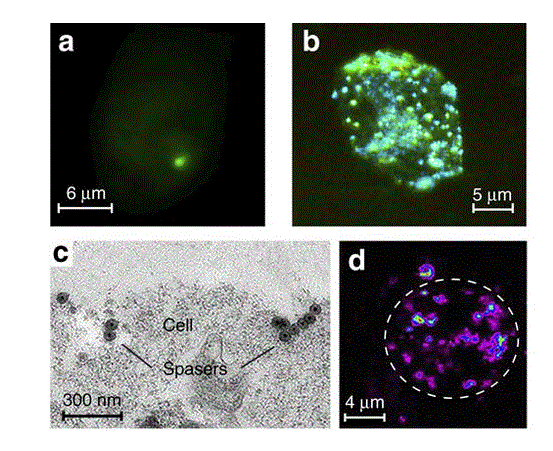 Cancer cells take up spaser nanoparticles. Breast cancer cells were incubated with nanoparticles with “surface plasmon amplification by stimulated emission of radiation” (spasers) composed of a gold sphere in the core and a silica shell containing the fluorescent dye uranine. These cancer cells took up the particles. From Galanzha et al. Spaser as a biological probe. Nat. Commun. 8, 15528 doi: 10.1038/ncomms15528 (2017).