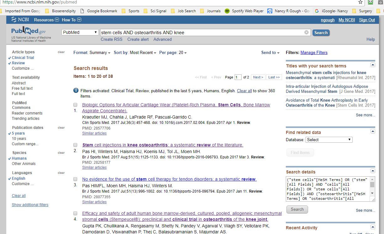 Figure 2. The results of a search of the biomedical literature for osteoarthritis, knee, and cell with filters applied. The search was performed on 5 January 2018. The filters applied were clinical trial, review, 5 years, humans, and English. These can be seen along the left side of the image.