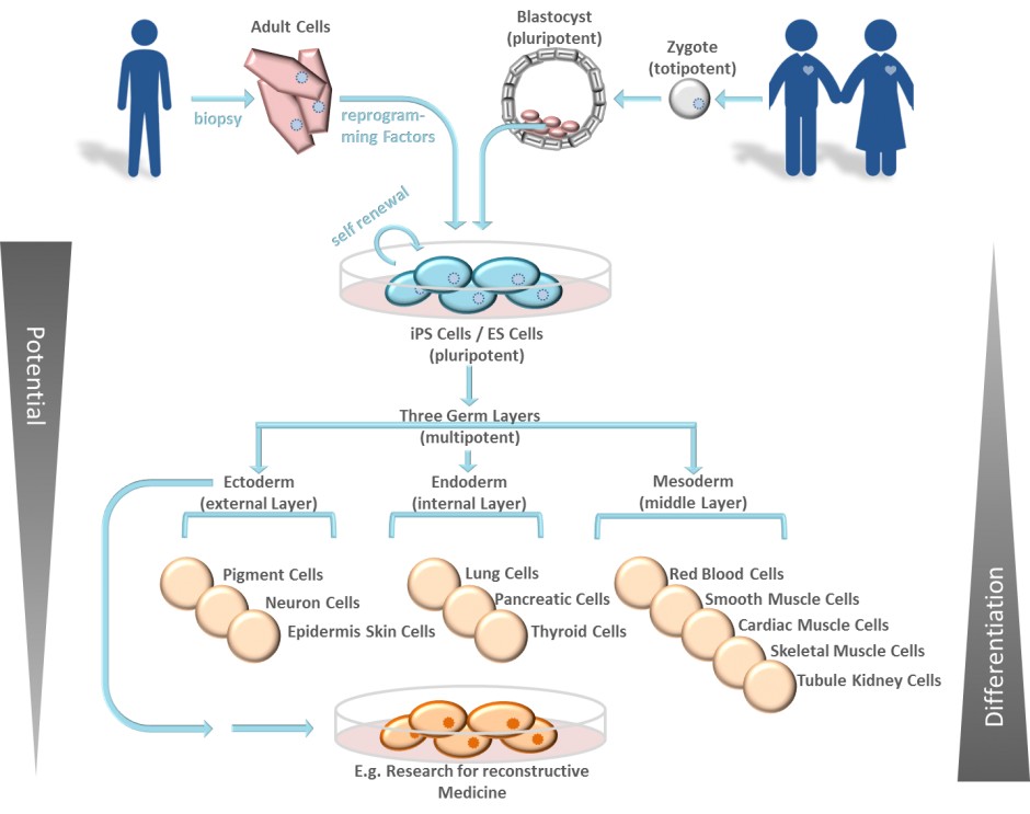 Stems cells are cells with the potential to form any kind of cell in the body and to regenerate other stem cells, a property called self renewal. This image is from Synentec (stem cells), a company providing equipment and cells for research and translational medicine purposes. The image shows the pluripotency index on the left, which decreases as the cells become more differentiated. The differentiation status index is on the right and is least when the cells are first isolated [embryonic stem (ES) cells] or induced to form pluripotent cells (iPS cells).