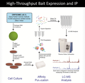 The BioPlex method is a technique for studying the interaction between proteins. Using molecular biology, proteins are tagged with hemagglutinin or FLAG and expressed in cultured cells. The proteins are then affinity purified using antibodies that recognize the FLAG or HA tag and interacting proteins are identified by mass spectrometry. Screen capture from the BioPlex site (http://bioplex.hms.harvard.edu/index.php) on 23 June 2017 with permission.