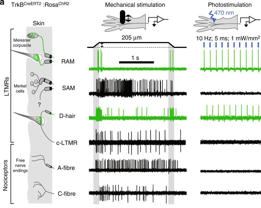 By comparing the response to mechanical stimuli with the response to light of TrkB-positive neurons expressing the light-activated channelrhodopsin2, neurons involved in the response to light touch were identified. The left shows a diagram of the nerves that were detected electrophysiologically. The middle shows the firing pattern of the 6 kinds of nerves when stimulated with touch (mechanical stimulation). The right shows the response of the TrkB-positive, optogenetically engineered nerves to light. D-hair and RAM nerves respond to light and touch, indicating those are the TrkB-positive sensory nerves innervating mouse skin. From Figure 2a Dhandapani, et al. Nat. Comm. 9, 1640 (2018) DOI: 10.1038/s41467-018-04049-3.